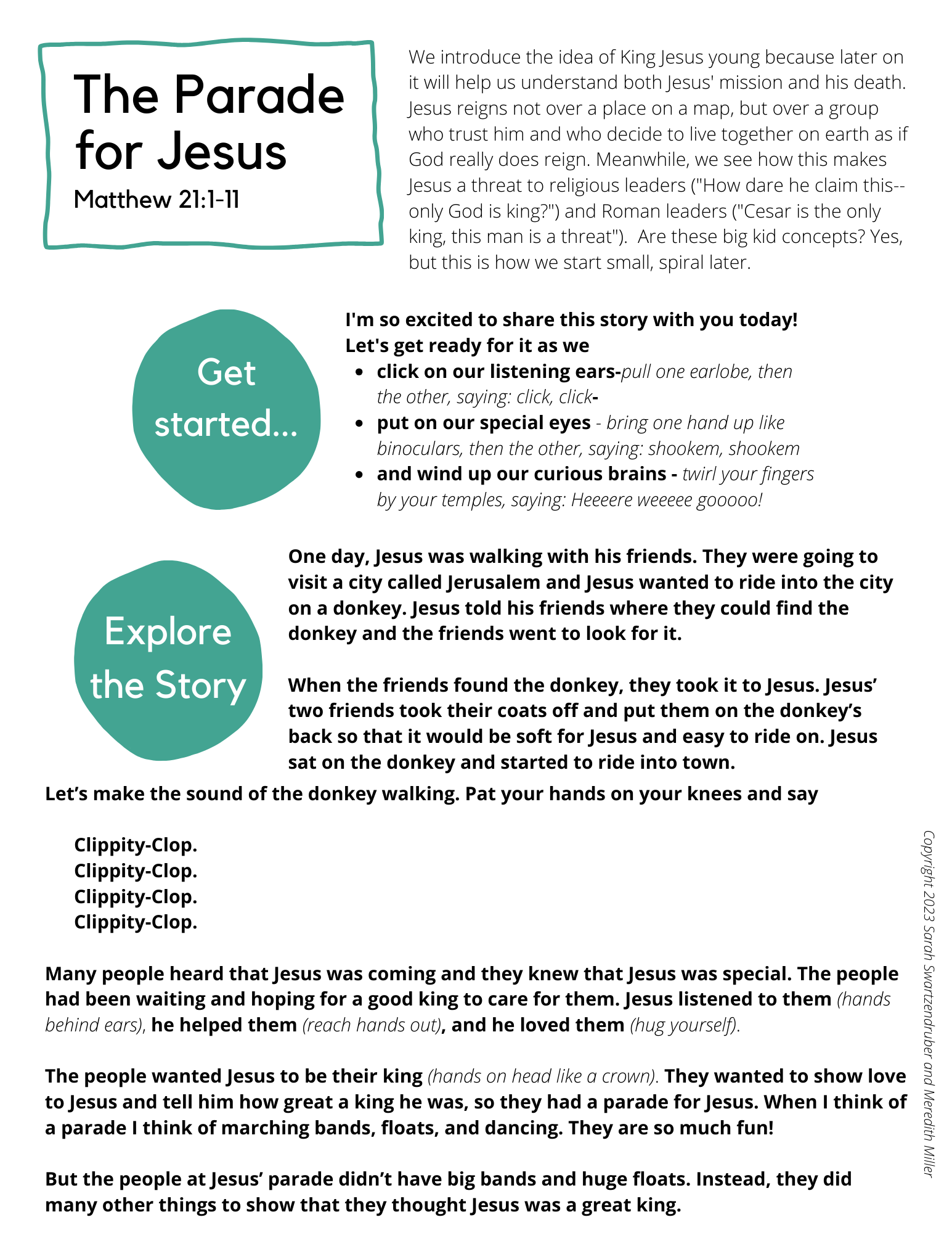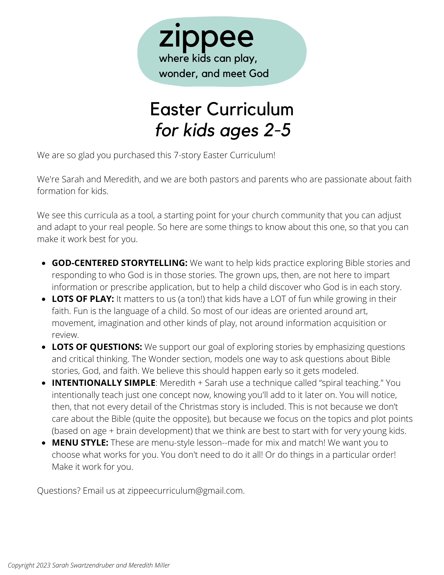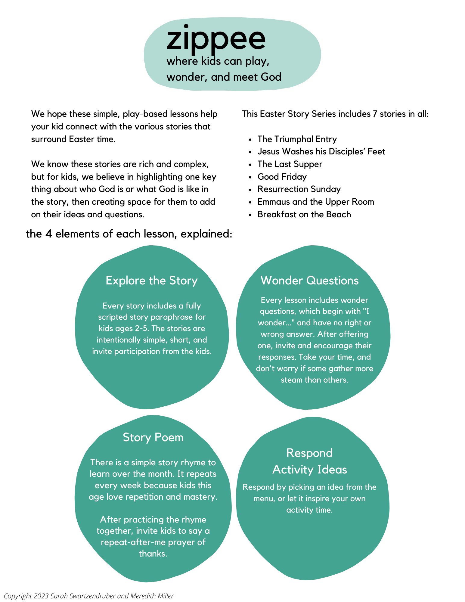 This Curriculum is a menu-style resources that offers intentionally simple lessons. We help you create space for kids to play, wonder and meet God.